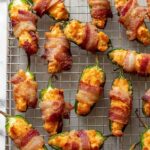 - Bake: Place the stuffed jalapeños on the rack-lined baking sheet and bake for 25 to 28 minutes or until the bacon is browned and crisp. For extra crispiness, broil for the last minute while watching carefully.