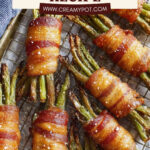 Thin cut bacon is best because it crisps up quickly and evenly, wrapping around the green beans nicely. Thick cut bacon can stay chewy and won’t crisp as well in this recipe.