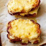 A classic French Croque Monsieur featuring layers of ham and Gruyere cheese on sourdough bread, enriched with a creamy béchamel sauce, pan-fried to golden perfection and baked with a cheesy gratin topping for a rich, indulgent meal.