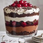 A decadent and layered Black Forest Trifle featuring moist chocolate cake cubes soaked in cherry liqueur, luscious cherry pie filling, rich chocolate pudding, and fluffy homemade whipped cream, garnished with fresh cherries and chocolate accents. Perfect for an elegant dessert to serve chilled.