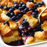 - Assemble casserole: Lightly grease a 9×13 inch baking dish. Spread half of the toasted bread cubes evenly in the dish and top with half of the blueberries. Pour half of the custard mixture over the top. Repeat layers with remaining bread, berries, and custard. Press gently with a spatula or your hands to submerge most of the bread in the custard, leaving some tops exposed. Cover with foil and refrigerate overnight.