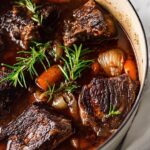 - Braise the short ribs: Return the short ribs to the pot along with beef broth, crispy bacon, thyme, and rosemary sprigs. Cover, reduce heat to low, and cook gently for 2 to 2 ½ hours until the meat is very tender and falling apart. If needed, cook longer for desired tenderness.
