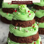 Create festive and delicious Brownie Christmas Trees using baked brownie mix circles stacked and decorated with green frosting, holiday sprinkles, and yellow star toppers, perfect for holiday parties and celebrations.