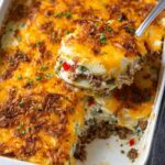 Hobo Casserole is a hearty, comforting dish featuring layers of seasoned ground beef, tender sliced potatoes, creamy soup sauce, and melted cheddar cheese, topped with crispy fried onions. Perfect for a family dinner, this casserole combines simple ingredients baked to perfection for a warm, satisfying meal.