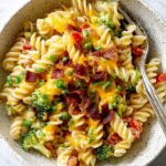 Lower the heat; stir in shredded cheddar and mozzarella one cup at a time until melted and smooth. Whisk in sour cream for extra creaminess, then fold in the chicken, broccoli, and half the bacon. Finally, fold in your cooked pasta so everything’s evenly coated. At this point, taste and adjust seasoning—it makes all the difference.