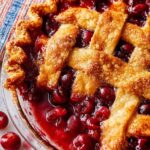 A classic sour cherry pie with a perfectly buttery lattice crust and a sweet, tart filling made from frozen tart cherries. This pie is a delightful summer dessert that can also be enjoyed year-round using frozen cherries. Serve warm with vanilla ice cream for an irresistible treat.