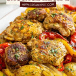 Arrange your seared chicken, browned sausage, and the sauce onto the baking sheet with those roasted potatoes. Spread everything out evenly so it cooks uniformly. Back into the oven it goes for another 20-25 minutes — this finishes cooking the chicken through (don’t forget to check for a safe 165°F internal temp) and lets the sauce thicken and soak into the potatoes and meat.