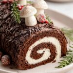 Buche de Noel, also known as Yule Log, is a classic French holiday dessert featuring a light cocoa sponge cake rolled with whipped cream filling, topped with rich chocolate ganache, and decorated with festive meringue mushrooms, sugared cranberries, and rosemary sprigs for a beautiful winter woodland theme.