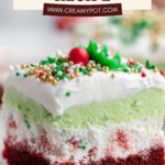 This festive Christmas Lasagna Dessert features a red velvet cake base topped with a creamy peppermint-cream cheese layer, a vibrant green vanilla pudding layer, and whipped topping adorned with holiday sprinkles. It's a delicious, no-fuss layered dessert perfect for holiday celebrations.