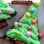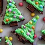 - Cut brownies into tree shapes: Once fully cooled, cut the brownies in half, then cut each half into triangles to resemble Christmas trees. Save any offcuts to eat or use in other treats.