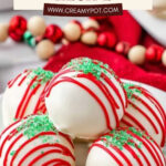 Delicious and festive Little Debbie Christmas Tree Cake Balls coated in white almond bark and decorated with green sanding sugar and red candy melt drizzle. Perfect for holiday celebrations and easy to make with just a few ingredients.