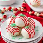 - Drizzle red candy melts: Place melted red candy melts into a storage bag and cut a very small corner off. Drizzle the candy melts back and forth over the truffles. Set aside to firm up, refrigerate for 10 minutes for quicker setting.