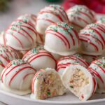 Delight in these festive Christmas Tree Cake Truffles made with Little Debbie Christmas Tree Cakes dipped in luscious white chocolate and decorated with holiday sprinkles and red candy drizzle. A perfect no-bake sweet treat to celebrate the season.