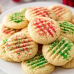 - Create Pattern and Add Sugar: Using a fork, gently press down on each dough ball to create a crisscross pattern. Sprinkle the tops generously with red or green sanding sugar for a festive touch.