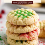 Preheat your oven to 350°F (175°C) and line a baking sheet with parchment paper. Scoop tablespoon-sized balls of dough, placing each at least an inch apart. Press down gently with a fork in a crisscross pattern, then sprinkle generously with red or green sanding sugar. Bake for 9 to 11 minutes, making sure they don’t brown at the edges — you want them soft and just slightly underdone when you pull them out.