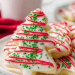Copycat Little Debbie Christmas Tree Cakes are festive, bite-sized treats featuring moist yellow cake layers with a fluffy marshmallow buttercream filling, dipped in smooth white almond bark, and decorated with green sanding sugar and red candy melt stripes. Perfect for holiday celebrations and dessert tables.