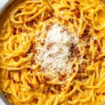 This creamy Butternut Squash Pasta features roasted butternut squash, caramelized onions, and roasted garlic blended into a luscious sauce, tossed with al dente pasta and crispy pancetta, finished with parmesan cheese and fresh parsley for a comforting and flavorful dish perfect for fall or any cozy dinner.