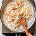- Combine: Transfer the pasta to the skillet with caramelized onions, pour in the cashew cream, and toss with tongs or spatulas. Return skillet to medium heat and cook for 5 minutes, stirring frequently to coat pasta evenly. Add reserved pasta water if needed to thin the sauce.