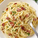 A classic Italian spaghetti carbonara recipe combining crispy bacon, creamy egg and Parmesan sauce, and freshly cracked black pepper for a rich, comforting pasta dish.