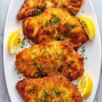 Classic Chicken Schnitzel features tender chicken breasts pounded thin, breaded with a seasoned flour, egg, and panko breadcrumb coating, then pan-fried until golden and crispy. Served traditionally with lemon wedges and Dijon mustard, it makes for a delightful main course with a crunchy crust and juicy interior.