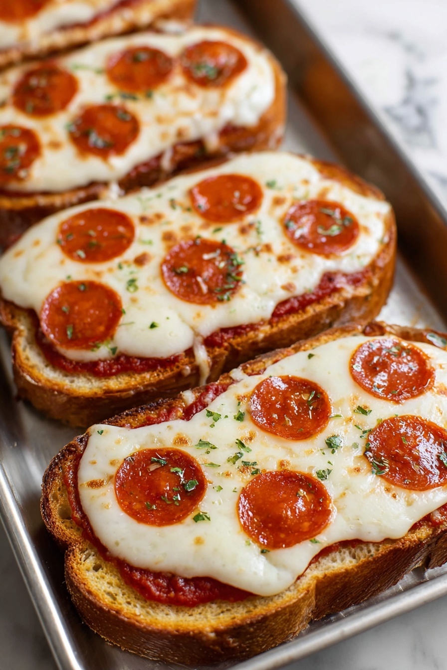 Take the bread out of the oven and spread 1 ½ cups of your favorite pizza sauce evenly over the four slices. Sprinkle 2 ½ cups shredded mozzarella cheese on top—remember, low moisture, whole milk mozzarella shredded from block melts best! Finally, add your 25 pepperoni slices or whatever toppings you love. Don’t be shy with the cheese—it helps everything stick together and get that melty goodness.