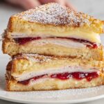 Experience the delicious and indulgent Monte Cristo Sandwich, a perfect blend of ham, turkey, Swiss cheese, and a touch of sweetness from red currant jelly, all dipped in egg batter and pan-fried to golden perfection. This classic sandwich is a delightful treat for lunch or dinner, offering a crispy crust with a gooey, savory inside.
