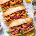 This classic Louisiana shrimp po' boy recipe features crispy, golden fried shrimp nestled inside light and pillowy French bread rolls, dressed with tangy remoulade sauce, pickles, and fresh veggies. It's a beloved American sandwich bursting with bold flavors and perfect for a satisfying meal.