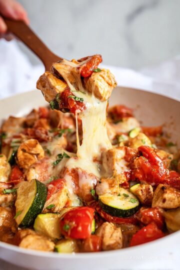 Zucchini Chicken Caprese is a flavorful one-pan meal featuring tender chicken breast, sautéed zucchini and tomatoes, and melted mozzarella cheese. Ready in just 30 minutes, this low-carb dish is perfect for a quick and healthy dinner packed with Italian-inspired flavors.