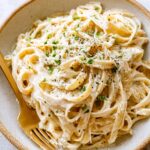 This easy Fettuccine Alfredo recipe features a rich and creamy homemade Alfredo sauce made with butter, garlic, heavy cream, milk, cream cheese, and freshly grated Parmesan cheese. Perfect for a comforting Italian dinner, it can be made ahead and reheated without losing its luscious texture.