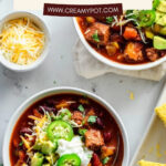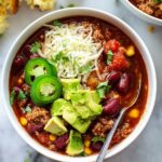 - Serve and garnish: Once cooked, ladle the chili into bowls and top with optional garnishes such as green onions, shredded cheese, avocado slices, and a dollop of sour cream or Greek yogurt if desired.