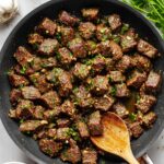 - Combine and Finish: Return the steak bites to the skillet and stir for 1 to 2 minutes to coat them well in the garlic butter sauce. Remove the skillet from the heat, stir in the chopped parsley, and garnish with sliced green onion before serving immediately.