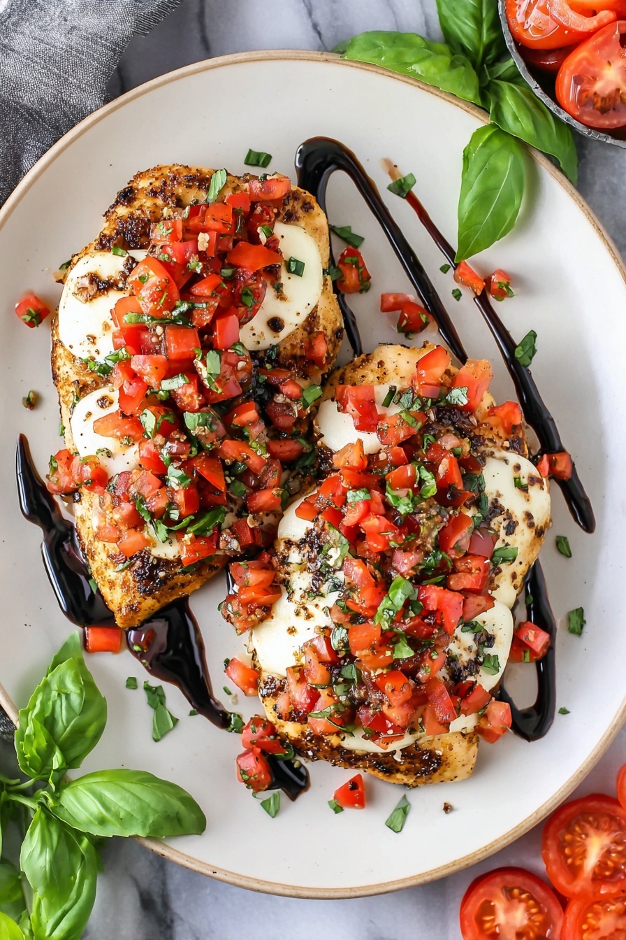 Finally, spoon a generous amount of the fresh tomato basil topping on each piece of chicken. Finish each serving with 4-5 tablespoons of balsamic glaze drizzled on top. The sweet tang of the glaze perfectly ties together the smoky grilled chicken, the vibrant tomato mixture, and the melted mozzarella for a plate that looks as good as it tastes.