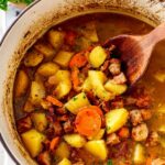 Dublin Coddle is a traditional Irish stew featuring thick-sliced bacon, pork sausages, potatoes, carrots, and onions slowly braised in chicken broth and Guinness stout for a hearty, comforting dish.