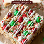 These Holiday Rice Krispie Treats are a festive twist on the classic marshmallow dessert, packed with crunchy Rice Krispies cereal, gooey melted marshmallows, colorful holiday M&M's, and sprinkles, finished with a drizzle of white chocolate. Perfect for seasonal celebrations and easy to make.