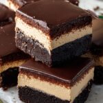 Deliciously rich Irish Cream Frosted Brownies featuring a moist chocolate base, creamy Irish Cream frosting, and a luscious Irish Cream ganache topping. Perfect for festive occasions or indulgent treats.