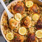 This Lemon Chicken Rice Bake is a comforting and flavorful one-pan meal featuring juicy marinated chicken thighs baked with aromatic lemon-infused rice. The chicken is first marinated in a zesty mixture of olive oil, white wine, lemon juice, garlic, and herbs, then seared to crispy perfection before baking with rice, broth, and fresh lemon slices. This wholesome dish combines tender chicken, fragrant rice, and bright citrus flavors for an easy family dinner.