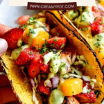 - Assemble Tacos: Remove cooked fish from skillet and break into large pieces. Divide fish pieces evenly among warmed tortillas. Top each with strawberry pineapple slaw and a dollop of avocado crema. Garnish with lime wedges and hot sauce if desired.