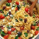 This Mediterranean Pasta recipe is a flavorful one-pot meal featuring tender lemon pepper chicken, angel hair pasta, fresh spinach, cherry tomatoes, kalamata olives, and creamy feta cheese, all cooked together in a rich sauce made with chicken broth, half and half, white wine, garlic, and Greek salad dressing. Perfect for a delicious and quick dinner with vibrant Greek-inspired flavors.