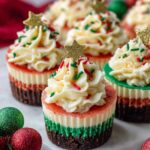 These Mini Christmas Cheesecakes feature a festive marbled red and green batter on a crunchy Oreo crust, topped with whipped cream and sprinkles. Perfectly portioned for holiday celebrations, they offer a creamy, tangy cheesecake experience with an eye-catching design.