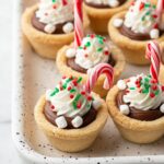 - Fill Cookie Cups: After baking, remove the cookie cups from the oven and immediately press a miniature Reese’s cup into the center of each warm cookie cup. Insert the peppermint stir stick candy canes at an angle near the edge of each cup. Allow to cool at room temperature for at least 20 minutes.