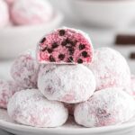 These Christmas Peppermint Snowball Sugar Cookies are festive, soft, and bursting with peppermint flavor. They feature a tender dough studded with mini chocolate chips, colored with a touch of pink food gel, and rolled in crushed peppermint candies and powdered sugar for the perfect snowy finish. Ideal for holiday celebrations and gifting.