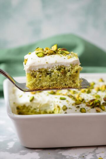 Want to save some for later? You can freeze unfrosted cake layers wrapped tightly in plastic wrap and then in aluminum foil for up to 2 months. Once ready to serve, thaw completely in the fridge, then prepare and spread the pistachio pudding frosting fresh. It’s best to avoid freezing the frosted cake because of the whipped topping’s texture.