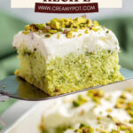 - Frost and garnish: Once the cake is fully cooled, spread the chilled pistachio pudding frosting evenly over the top. Sprinkle chopped pistachios on top if desired.