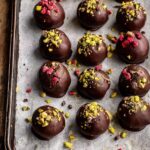 - Decorate and Set: Before the chocolate sets, decorate with cacao nibs, chopped pistachios, or extra freeze dried raspberries as desired. Refrigerate to fully set the coating.