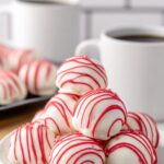 - Decorate: Lightly drizzle the melted red candy melts over the coated cheesecake bites in stripes for a decorative finish.