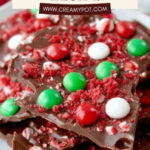 A festive and easy-to-make Christmas bark featuring creamy milk chocolate, crunchy red velvet cookie pieces, and peppermint M&Ms. Perfect for holiday snacking and gifting.