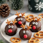 Delicious and festive Reindeer Oreo Balls made with crushed Oreo cookies, cream cheese, and coated in rich dark chocolate. These bite-sized treats are decorated with pretzel antlers, candy eyes, and a candy nose to resemble adorable reindeer, perfect for holiday parties and celebrations.