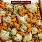 A flavorful and hearty roasted dish featuring tender butternut squash, cauliflower florets, and crispy chickpeas, seasoned with garam masala and a touch of maple syrup. Perfect as a wholesome side or a light main, garnished with fresh parsley for a bright finish.