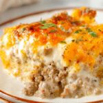 A hearty and comforting Biscuits and Gravy Breakfast Casserole featuring sausage gravy, fluffy eggs, and tender biscuit pieces baked together with melted cheddar and Monterrey Jack cheeses for a delicious morning meal perfect for family gatherings or brunch.
