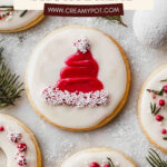 - Create Santa hats: Melt white chocolate and fill a pastry bag. Mix remaining chocolate with red oil-based food coloring in a piping bag. Snip bag tips or use small tip. Pipe red hat shape with white chocolate trim and top, then add sanding sugar. Optionally, use green coloring to pipe Christmas tree designs on remaining cookies.